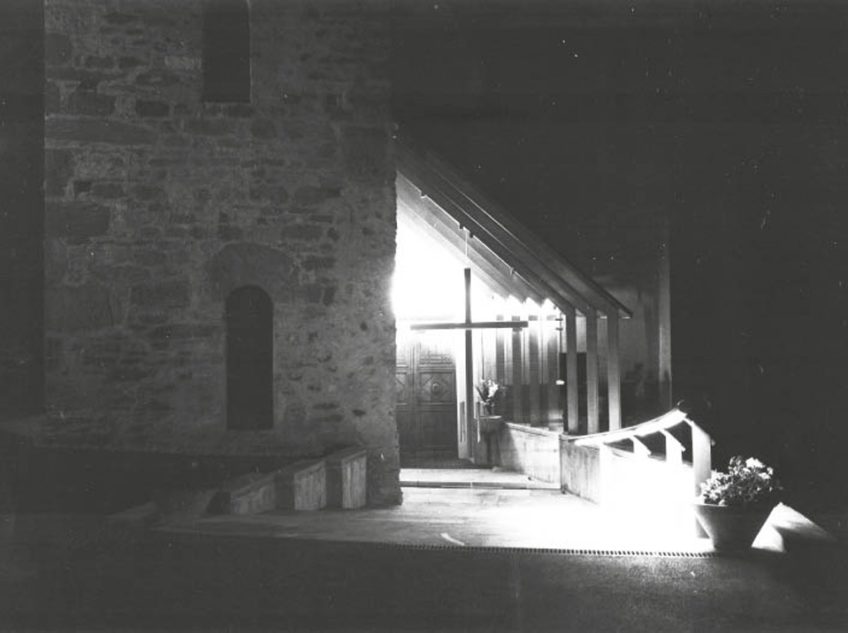 Le réaménagement de l’entrée à l’Eglise a procédé d’un nouvel emmarchement dénivelé en creux avec un porche vitré (structure métallique) de facture architecturale contemporaine.