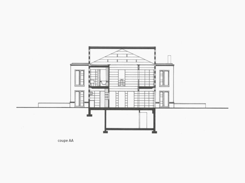 Le volume à caractère volontairement introverti de cette maison exprime sa perméabilité à la lumière par les 4 grandes façades pignons. Constructions légères (bois et jalousies aluminium) par opposition à la construction lourde et fermée des angles. Ce sont elles qui filtrent et qualifient la lumière, qui rythment la vie intérieure, qui identifient la succession des plans intérieurs, qui rendent la vision de la toiture comme flottante.